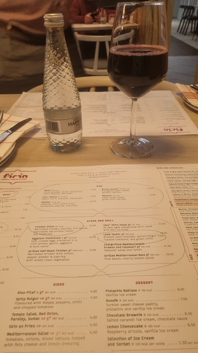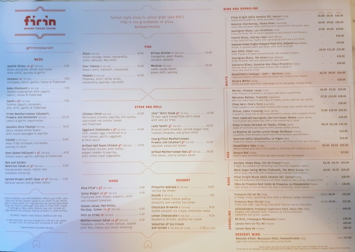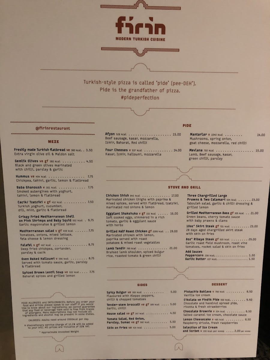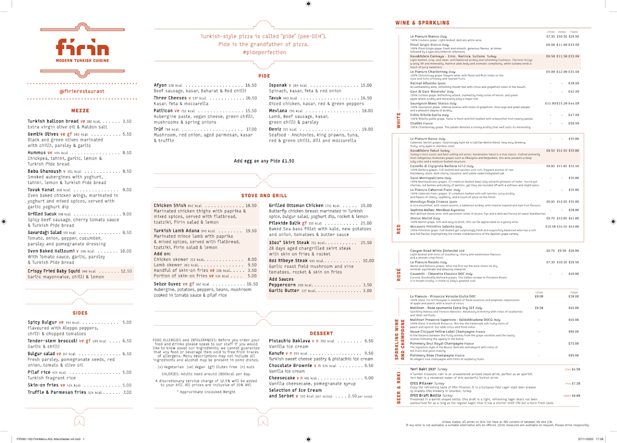 The menu at Firin Modern Turkish Cuisine at Manchester Airport offers a vibrant selection of traditional Turkish dishes with a modern twist. For starters, you can indulge in their Mezze options like Turkish balloon bread, Gemlik Olives, and creamy choices like Hummus, Baba Ghanoush, and Cacik/Tzatziki. Their Pide section features delicious flatbreads, including the Afyon, Ispanak, Patlican ve Three Cheeses, and Tavuk varieties, perfect for those craving savory combinations. For a heartier meal, the Stove and Grill menu boasts choices such as Chicken Shish, Turkish Lamb Adana, and Deniz Ürünleri Tabak. Seafood lovers can try the Pilekide Balik, while the 10oz Skirt Steak satisfies those looking for a rich meat option. Sides include the flavorful Spicy Bulgur, fresh Tender-stem broccoli, Tabbouleh & Pomegranate salad, and comforting Pilaf rice and Skin on Fries. To end your meal on a sweet note, their dessert offerings include the indulgent Pistachio Baklava, Kanufe, and Chocolate Brownie, along with the creamy Baklava Cheesecake and a selection of refreshing Ice Cream and Sorbet. The variety and quality of the menu ensure a memorable dining experience for anyone visiting Firin Modern Turkish Cuisine.